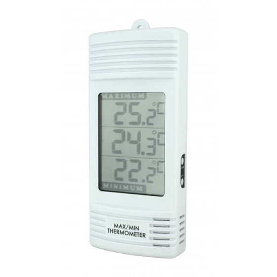 The Agrihealth Min/Max Digital Thermometer is a robust white plastic thermometer that displays the current, maxium, and minimum temperatures.