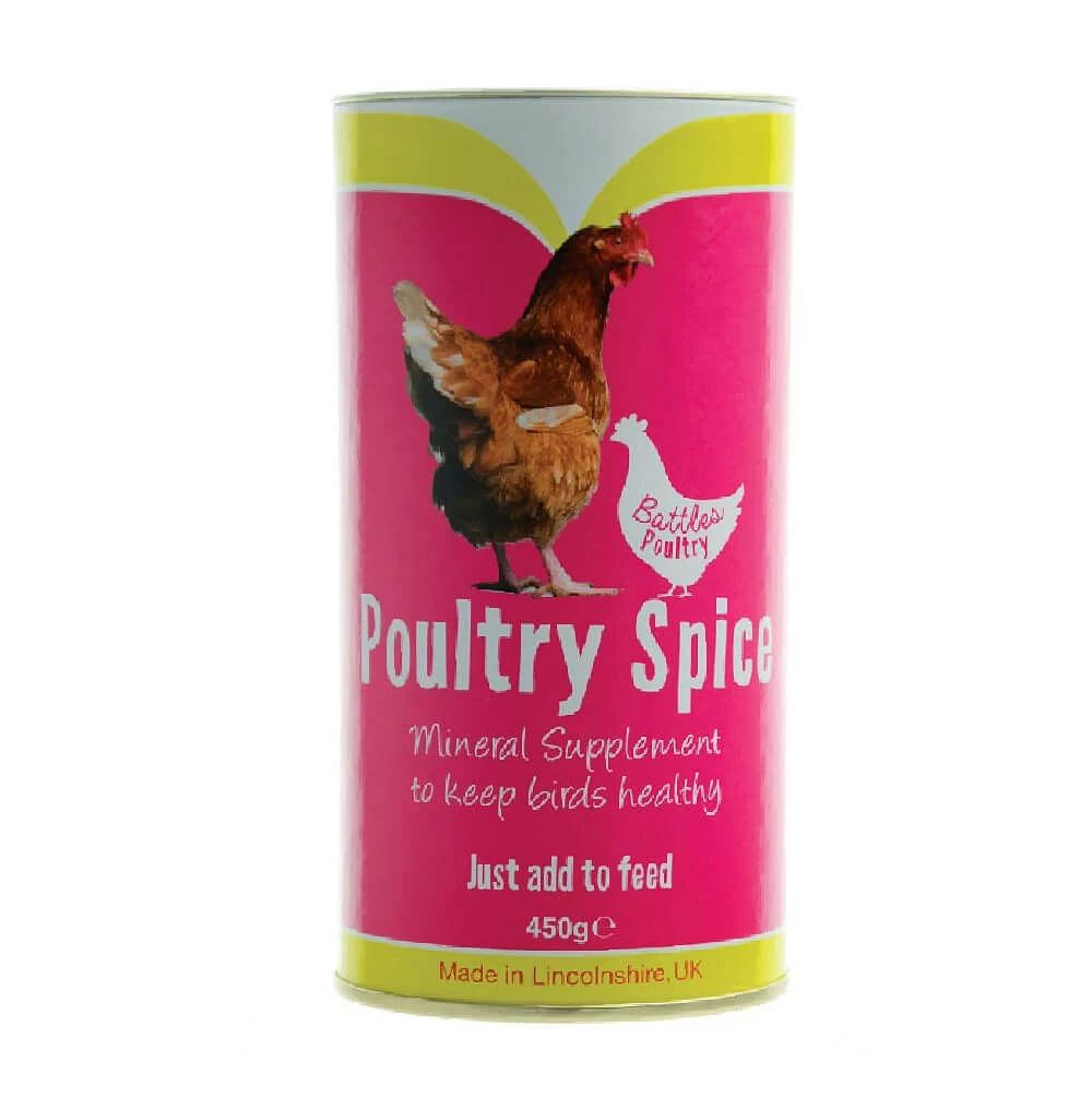 Battles Poultry Spice can be used all year round to maintain good health. Invaluable when rearing Poultry, Ducks, Geese, Turkeys, Chickens and Game Birds. One teaspoonful to feed for every 10 birds.