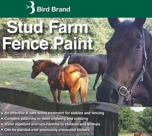 Bird Brand Stud Farm Fence Paint 10L Dark Brown is an effective and safe wood treatment for stables and fencing, containing additives to deter chewing and cribbing. Bird Brand Stud Farm Fence Paint 10L Dark Brown is water repellant and non-harmful to children and animals and can be painted over previosuly creosoted timbers.