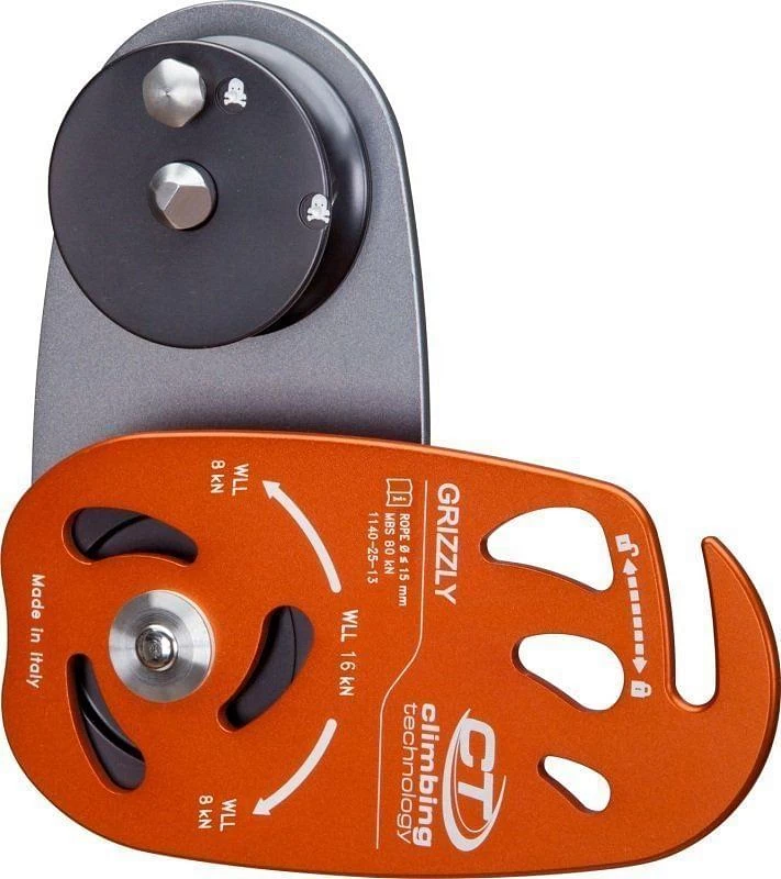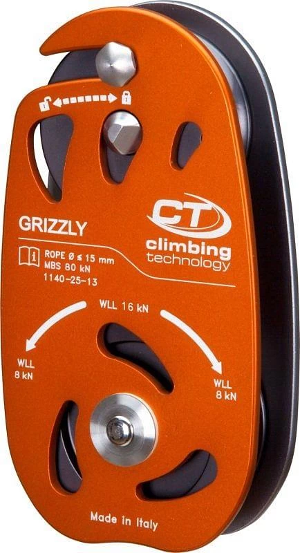 The Climbing Technology Grizzly Pulley is a pulley for tree felling for high loads of up to 80 kN. It has a very simple and safe opening system and the closure mechanism avoids any accidental opening when it is in use. It features aluminium pulleys and flanges as well as steel axles and self lubricating bushings. It is suitable for ropes of up to 15mm diameter.