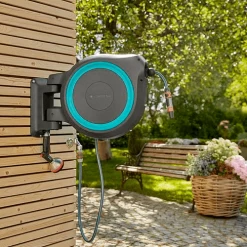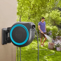 The Gardena Wall-Mounted Hose Box RollUp (18620-20) is a convenient and practical garden irrigation tool that’s always ready for action. The Hose Box RollUp makes watering your garden a comfortable and enjoyable experience, as you no longer have to worry about wrestling your unwieldly hose around your garden. For use, simply pull out the 25m hose to the desired length and as soon as you stop, the extra short locking points grip and secure the garden hose. When you’re finished, a light pull on the hose is enough to unlock the grip and the Gardena hose begins neatly winding itself away again, using Gardena’s RollControl technology to ensure a safe and controlled reaction into its convenient wall-mounted box. Rotating a complete 180 degrees, the Gardena Wall-Mounted Hose Box RollUp provides you maximum freedom of movement and follows your movement around the garden unnoticed. With tap and hose connections from the original Gardena System, you can flexibly extend the hose or attach other Gardena watering attachments. Your Gardena hose attachments are always ready to hand: they can be stored underneath the wall-bracket for a space-saving, convenient solution. The hose box comes complete with all necessary connecting parts: wall bracket, connecting hose, all necessary Original Gardena System and assembly parts, as well as a nozzle with two different spray jet options.
