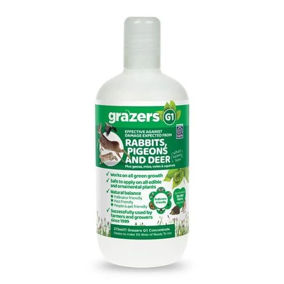 Grazers G1 Concentrate 750ml is an effective solution to protect garden plants against rabbits, pigeon, deer and geese. Grazers G1 Concentrate helps garden plants to help themselves against their pests, whilst safe to all wildlife. Treats 2000m2.