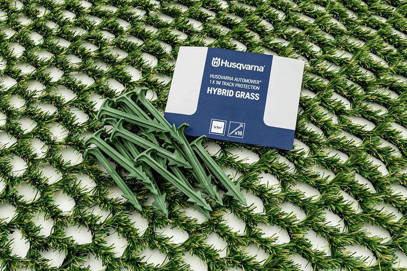 Husqvarna Hybrid Grass 1m² provides grip to robotic mower for improved capacity in narrow and steep areas. Buy using Husqvarna Hybrid Grass you can prevent the robotic mower from stopping, spinning and wear of lawn on slopes or frequent spots where limited possibilities for variation of distance to guidewire. 1×1 meter hybrid grass including 16 green stakes.