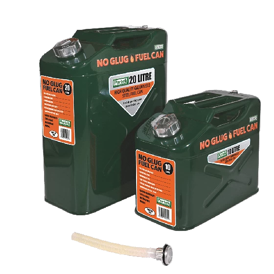 The Portek No Glug Fuel Can is made from a high-quality galvanised steel and is suitable for use with petrol, diesel, two-stroke and other liquids. The Portek Fuel can features an adjustable air vent, a hand grip base for easy pouring, a flexible spout with filter and a spout stored inside the can. The No Glug Fuel Can guarantees no glugs or splashes when pouring. Available in 10L or 20L options.