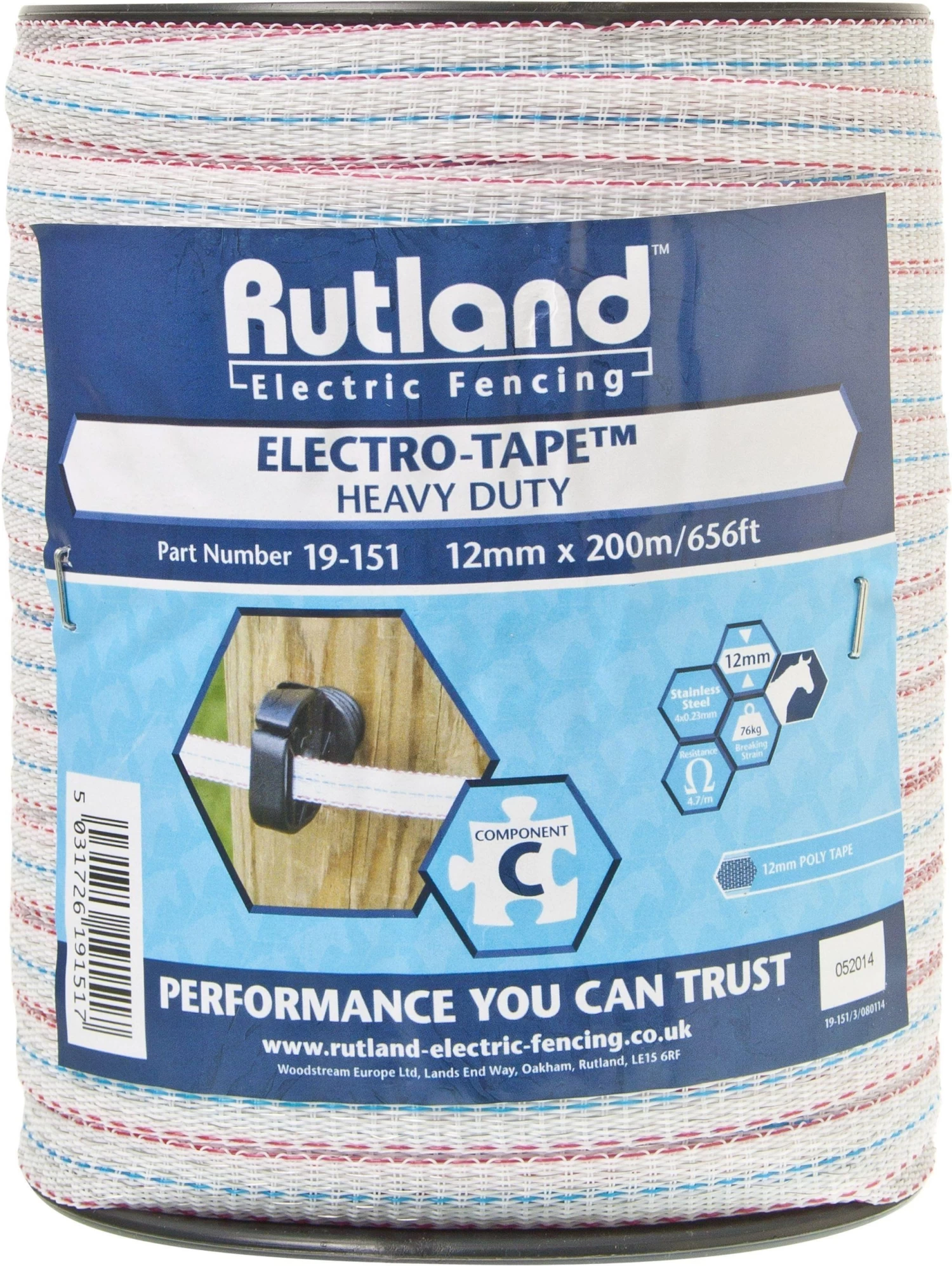 The Rutland 12mm Electro-Tape White is available on a spool of 100 m or 200 m. The 12 mm wide electric tape features 4 x 0.25 mm stainless steel conductors.
